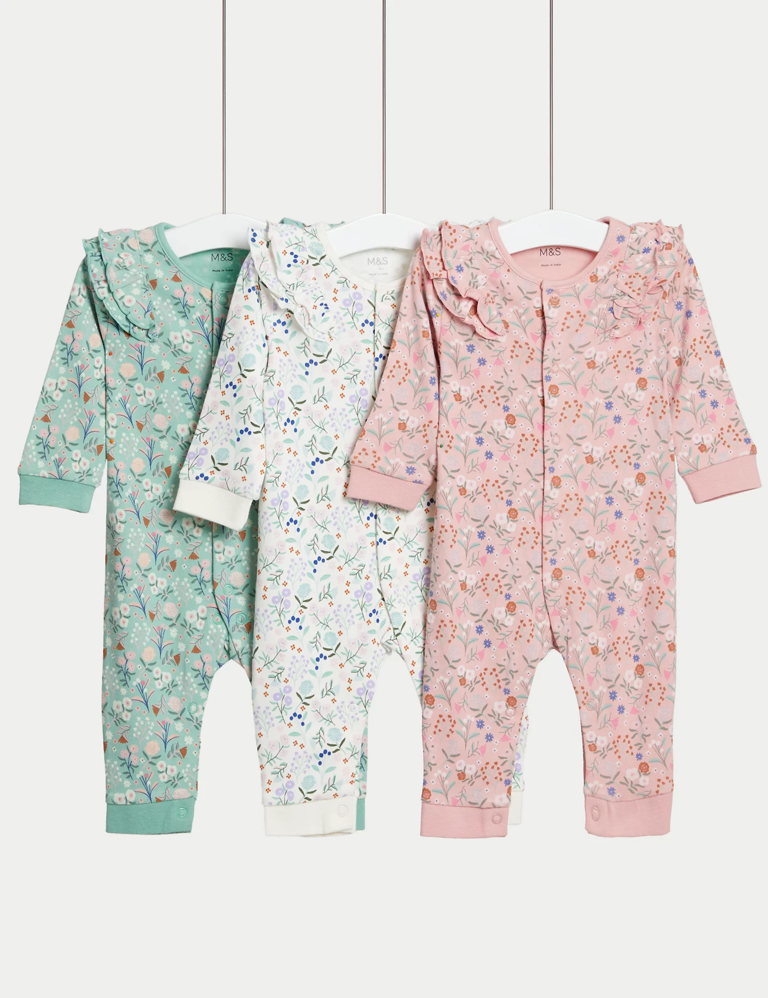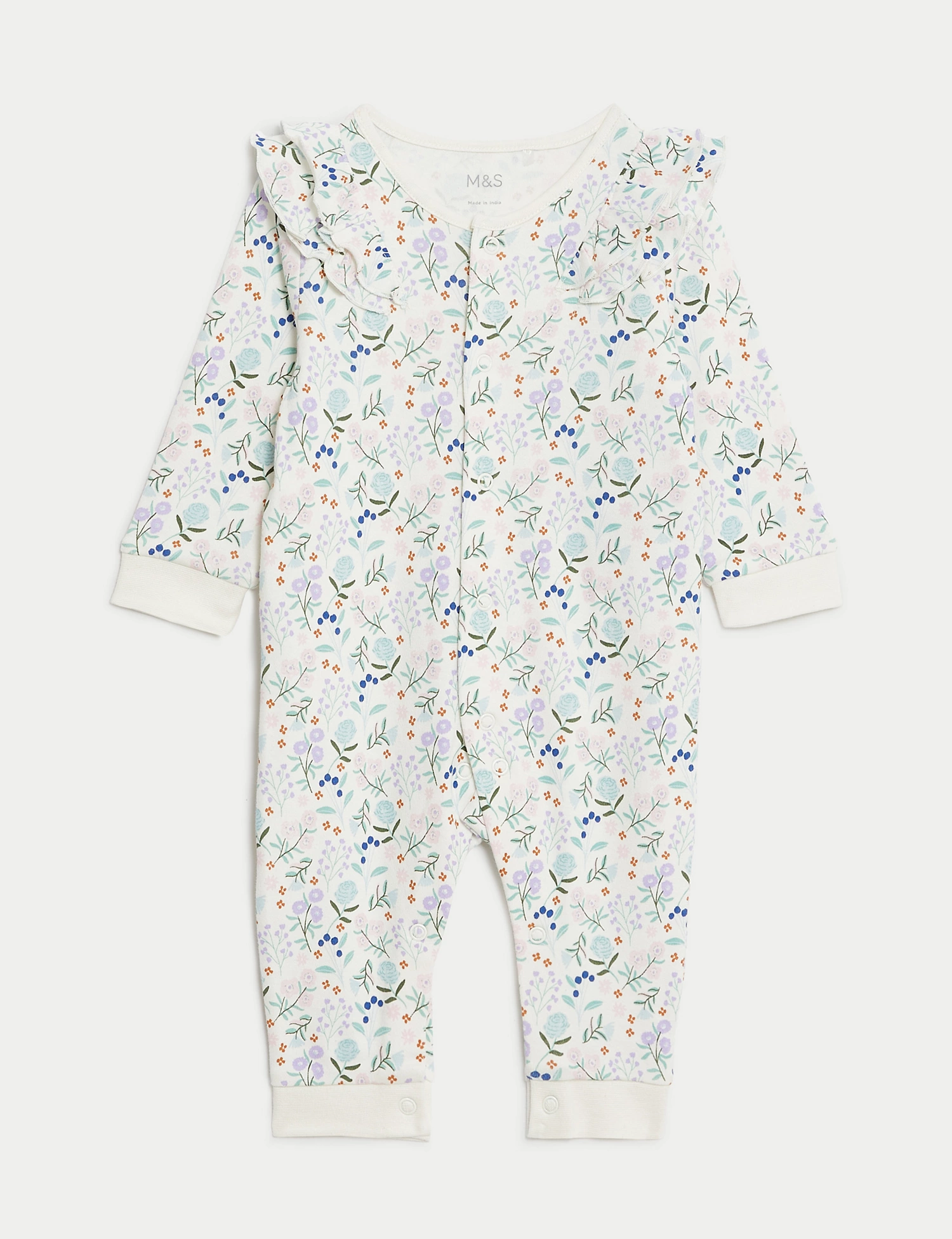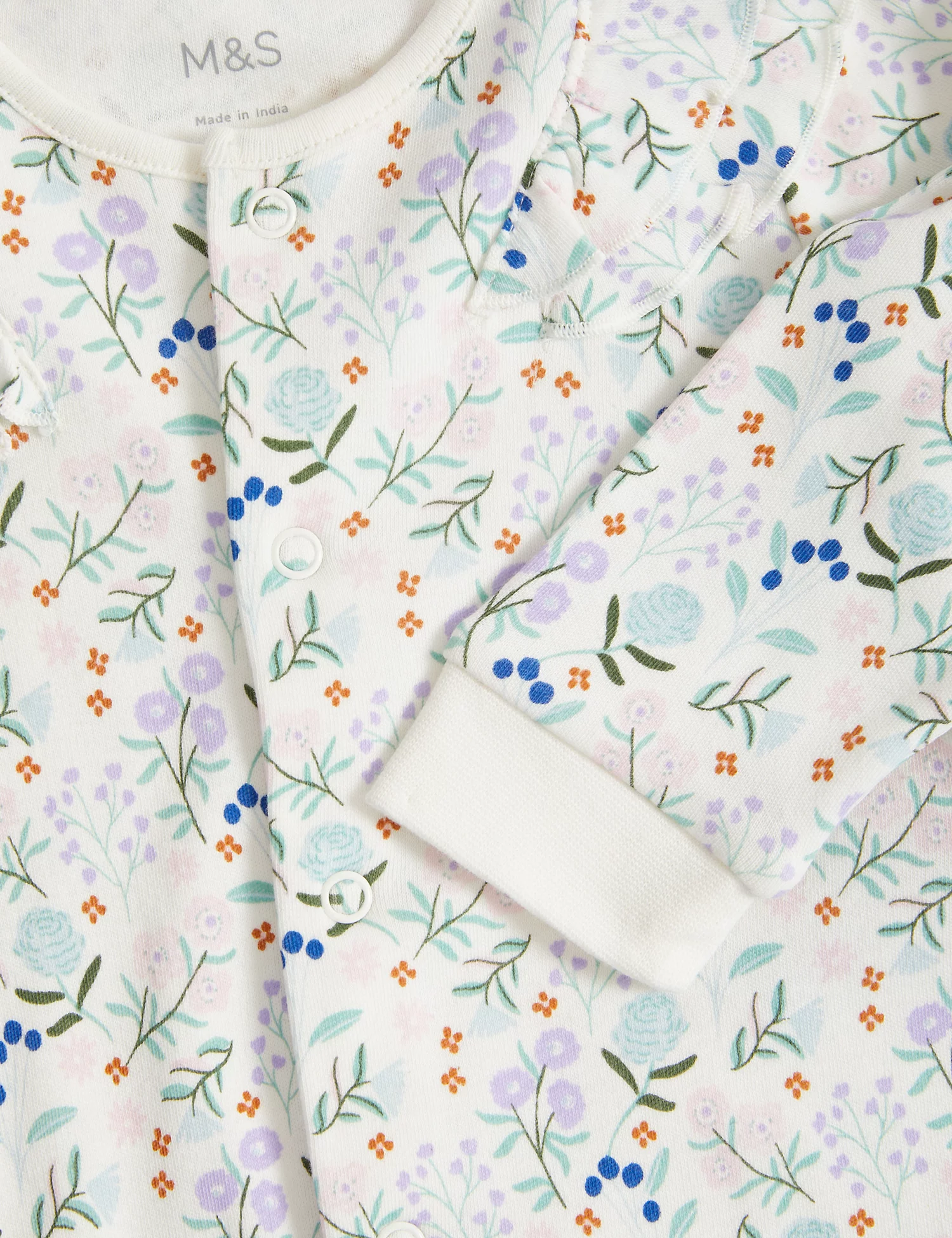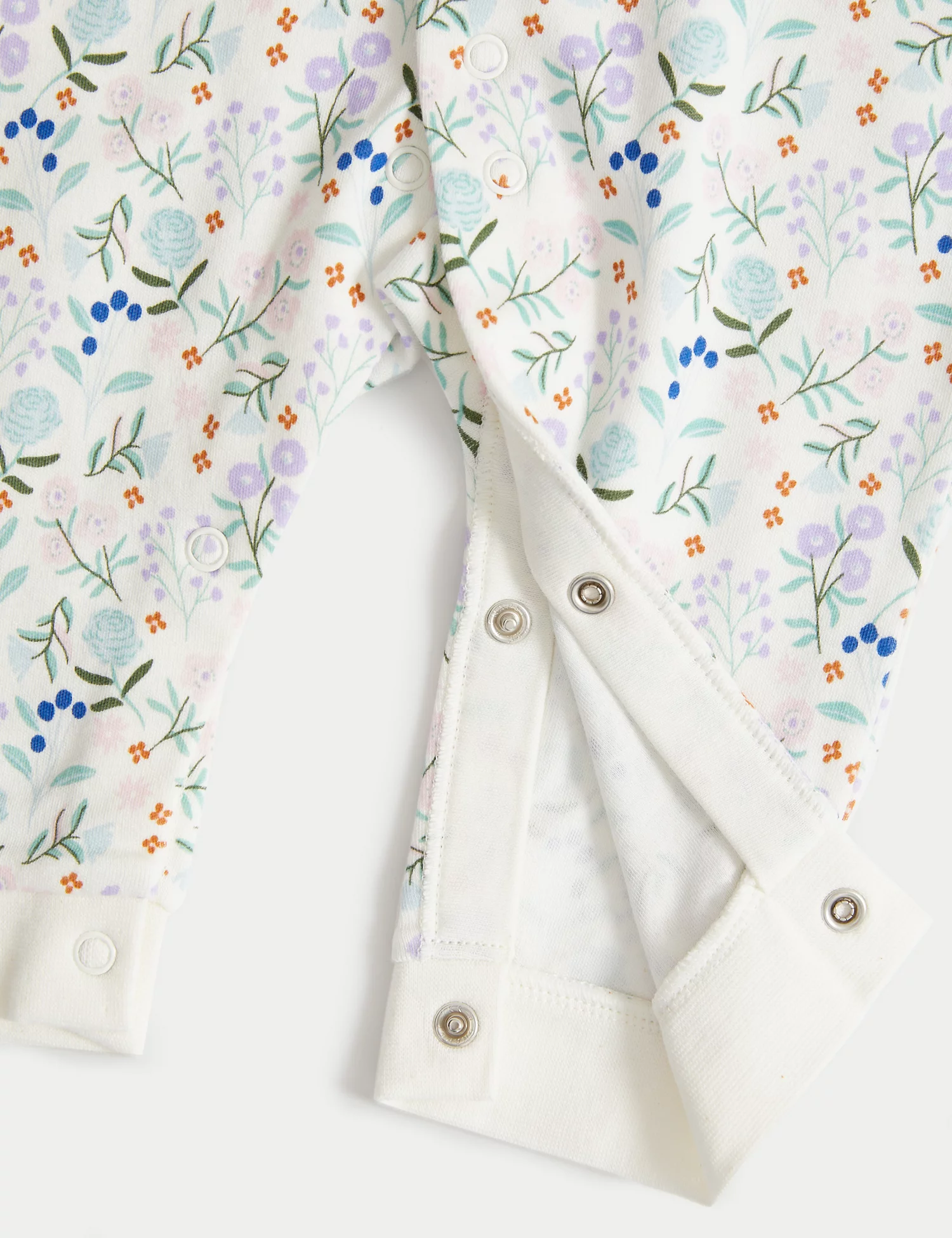 Made from pure cotton, this sweet printed all-in-one will keep them super snug. Popper fastenings at the front and on the legs ensure easy changing. Cosy wadded design with a tog rating of 1.5. Finished with a woven badge at the chest. Made with recycled polyester filling. We only ever use responsibly sourced cotton for our clothes.